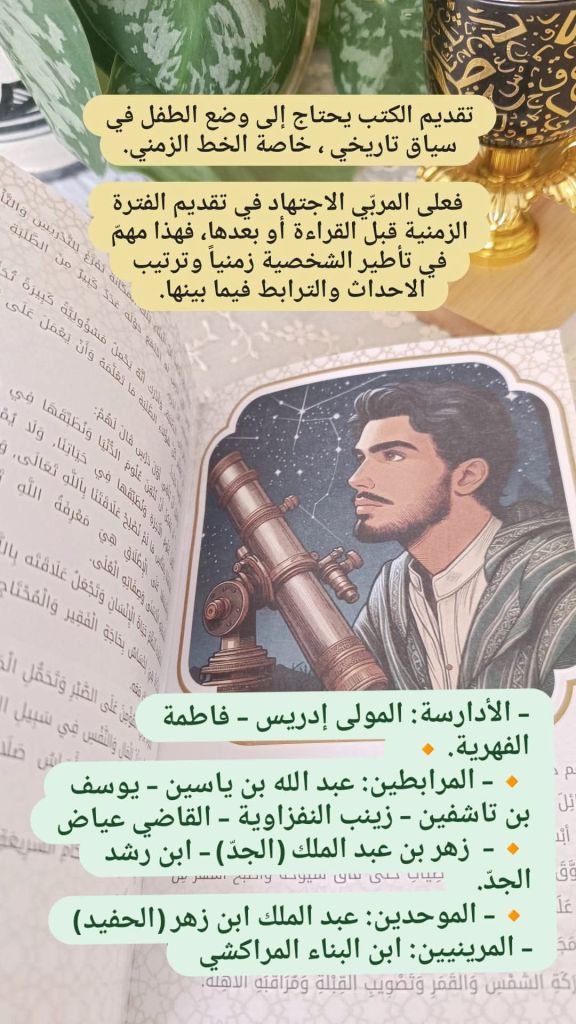 فهي سلسلة خيالية ،تتميز بأسلوب جميل ولغة سليمة وبنية سردية مشوقة، لكن المعلومات التاريخية الواردة بها ليست كلها صحيحة. أقترح أن يتعلم الطفل عن سيرة العلماء من كتب أخرى او وثائقيات. بعض حلقات رسوم “العلماء المسلمين” قد تكون فكرة جيدة للإطلاع والمقارنة بين المعلومات..