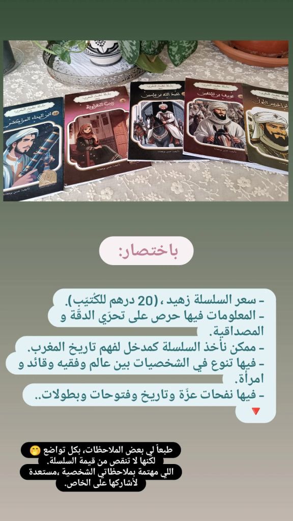وهذه ليست الاقتراح كمرجع تاريخي، ولكن للتنبيه إلى⚠️ بعض الأمور المتواجد في السلسلة. يختلط في السيرة التاريخية سيناريوهات خيالية وأحداث خيالية. ربما لإضفاء المتعة والتشويق، لكن الطفل الذي يقرأ هذه السلسلة سيقرأها من باب التسلية ولا بد أن يكون قد أخذ معلومات عن الشخصية التاريخية مسبقاً حتى يفهم السياق.