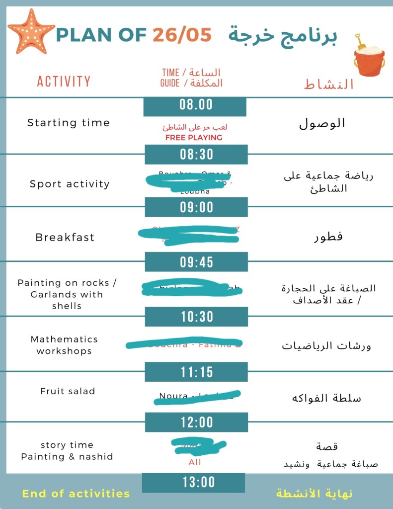 كان دوري هذه المرة في إعداد البرنامج. وساعدتني أم أخرى في إغناء قائمة التحضيرات والتوضيحات ، فهذه الخرجة كان التخطيط لها في أسبوع فقط، مما جعلنا نسابق الزمن في ترتيب الأمور.