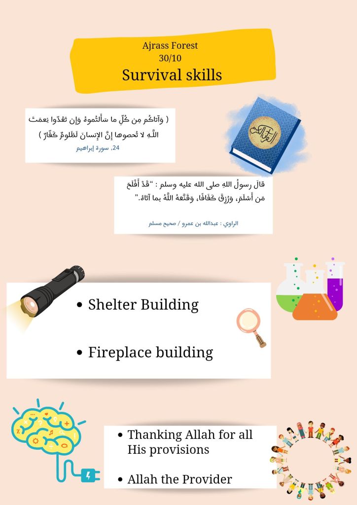 وهذه الخرجة الأولى وكان فيها التعرف على بعض المهارات الحياتية. لكننا مسلمون وكل ما نتعلمه لابد أن يخرج من مشكلة الوحي، فكانت كل مهارة نتعلمها أساساً للمسلم القويّ الذي يشكر الله على نعمه ويستفيد مما سخره الله له في العيش بكرامة وإيمان.