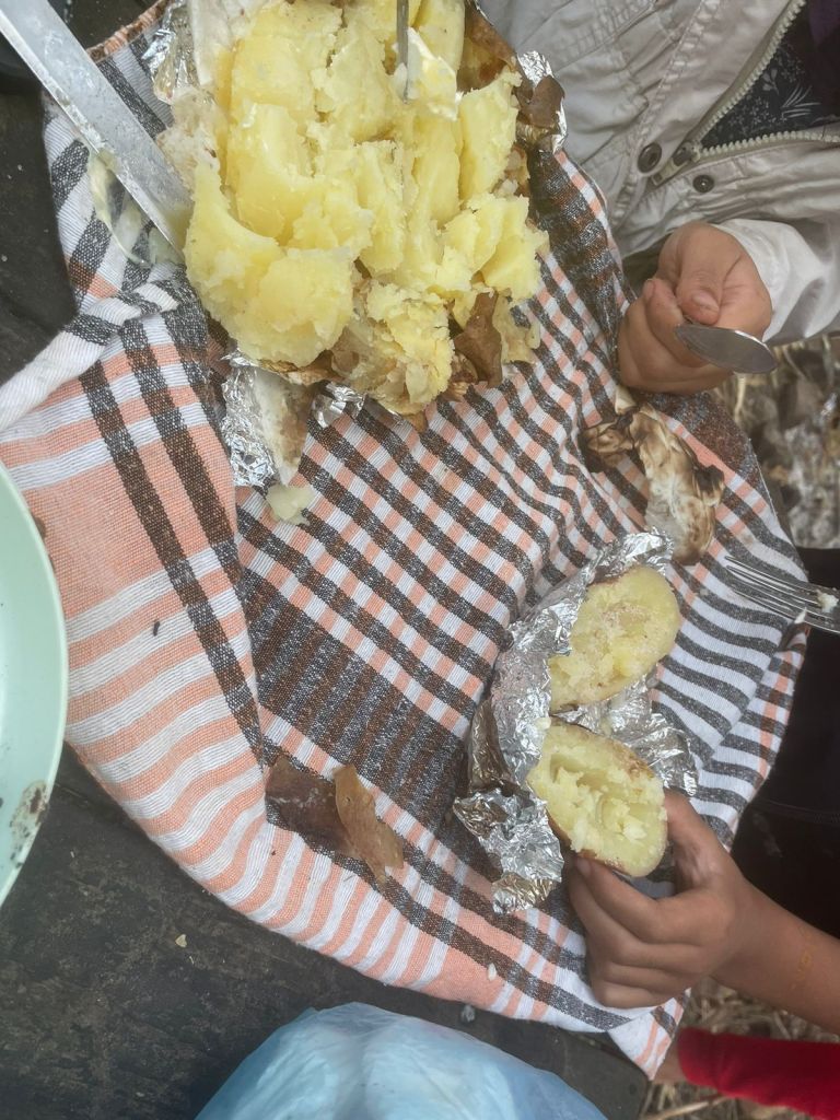 في مرحلة إشعال النار كانت الريح تأتي من الجهة المكشوفة ، فأشعلت بعد جهد . ثم وضع كل واحد له بطاطا ملفوفة بورق ألمنيوم وموزا بالشوكولاتة. كانت تجربة الموز جديدة علينا.