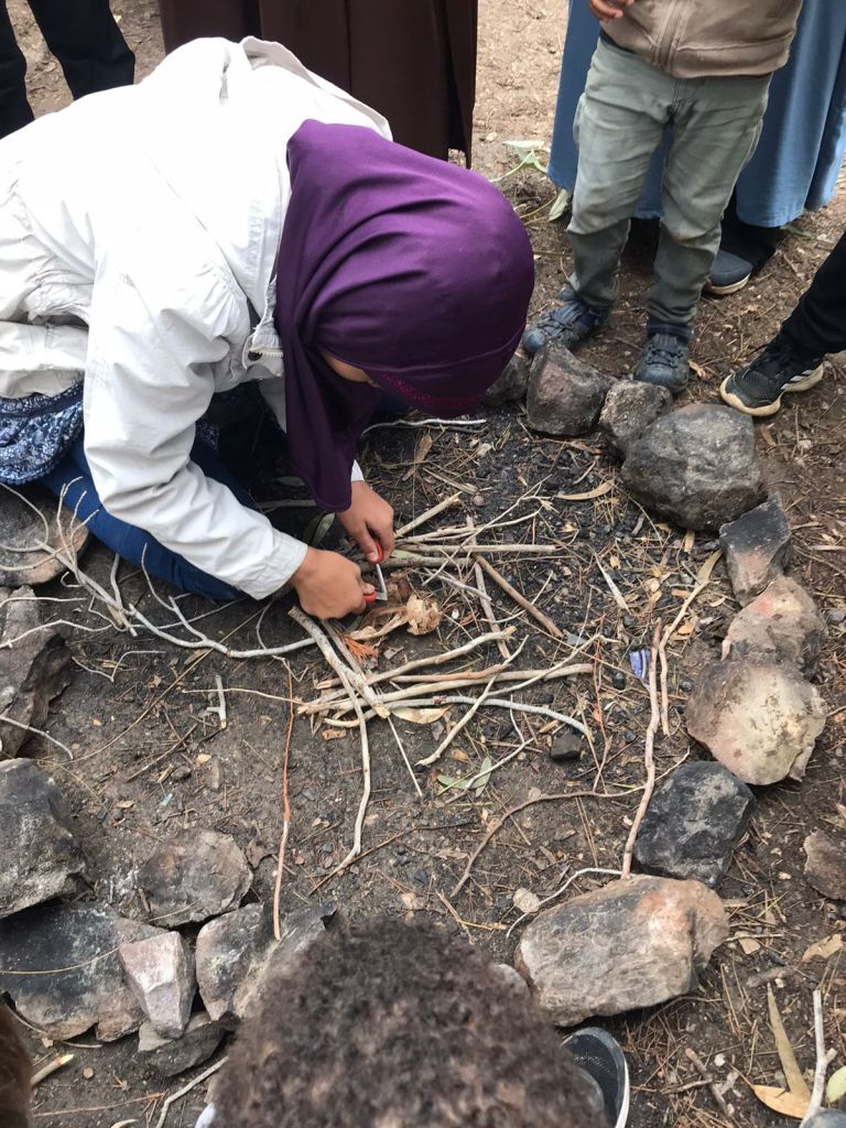– نشاط إشعال النار : وكان جماعيا، طلبت منهم المشرفة جمع أغصان صغيرة لتسهيل الإيقاد.