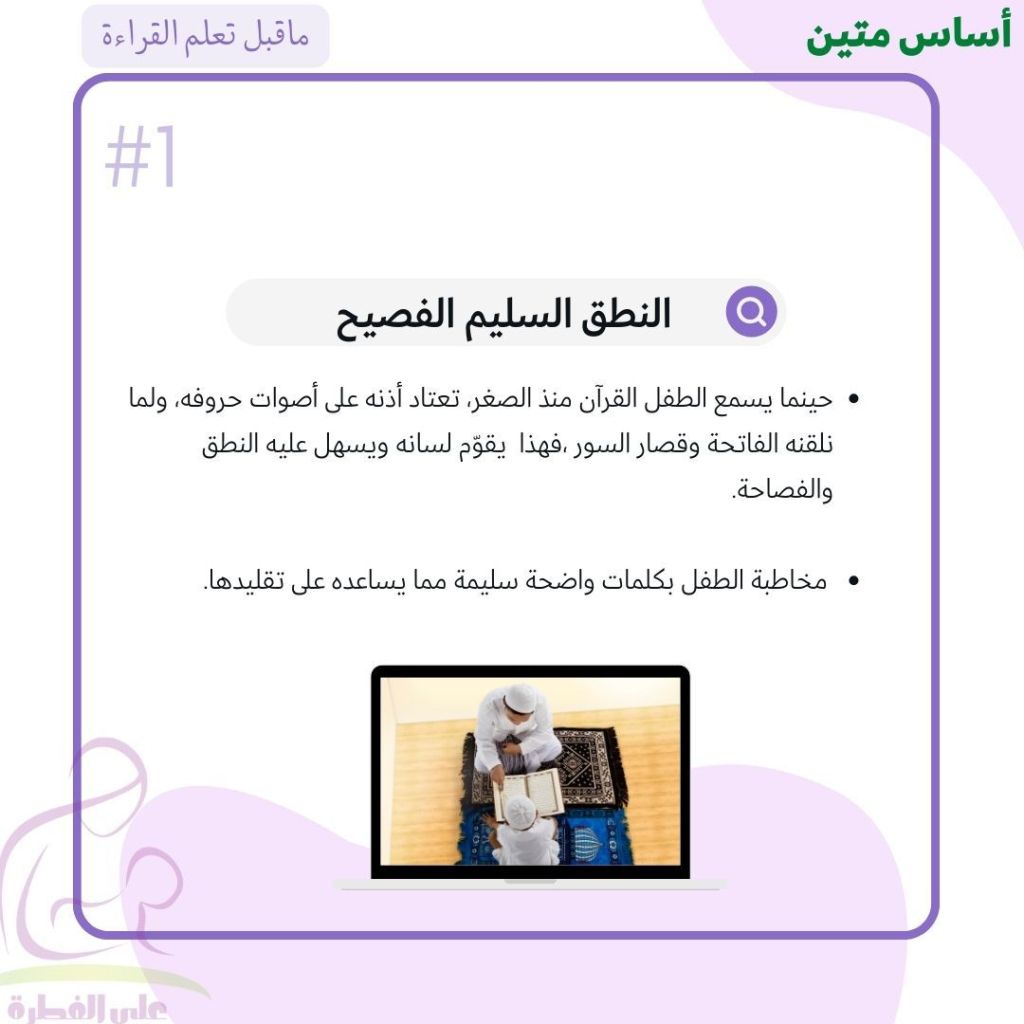 فالنطق السليم يعني تعويد الطفل على سماع القرآن الكريم وتلقينه بعض الآيات منذ الصغر فهذا يقوّم لسانه ويعوّده على سماع لغة فصيحة.