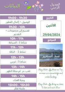 – مرحلة إعداد باقة الزهور : الذهاب إلى غابة قريبة من الموقع، لاستكمال الأنشطة والبرنامج. وقد كان من ضمنها نشاط جمع البقول لتحضيره، وتمييز نوعين من النباتات الطبية بالمنطقة، وإيقاد النار لإعداد الشاي بالأعشاب وطاجين البقول بالثوم