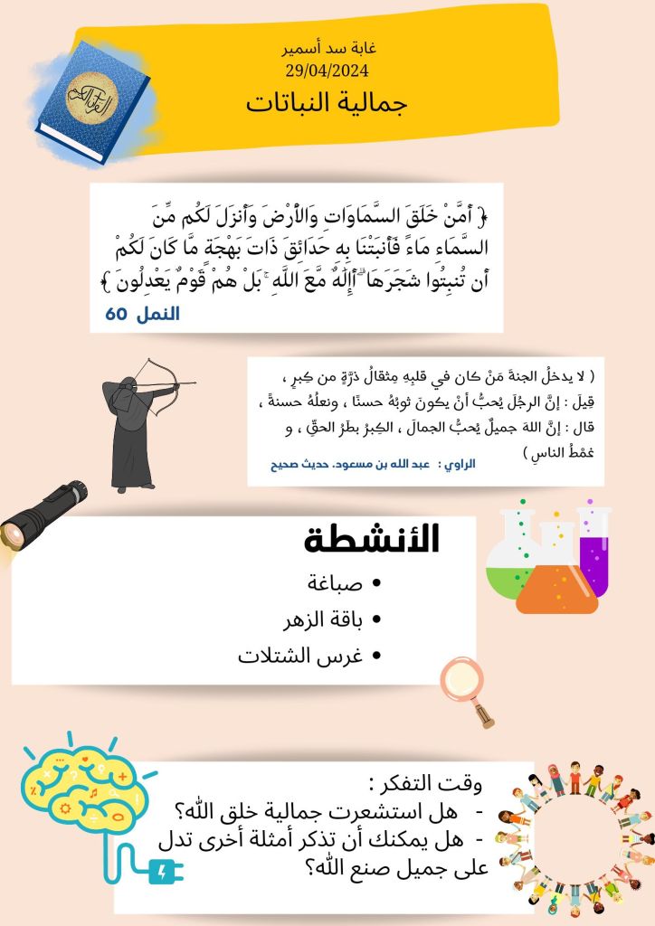 ✓ ورقة موضوع جمالية النباتات+ آية وحديث.