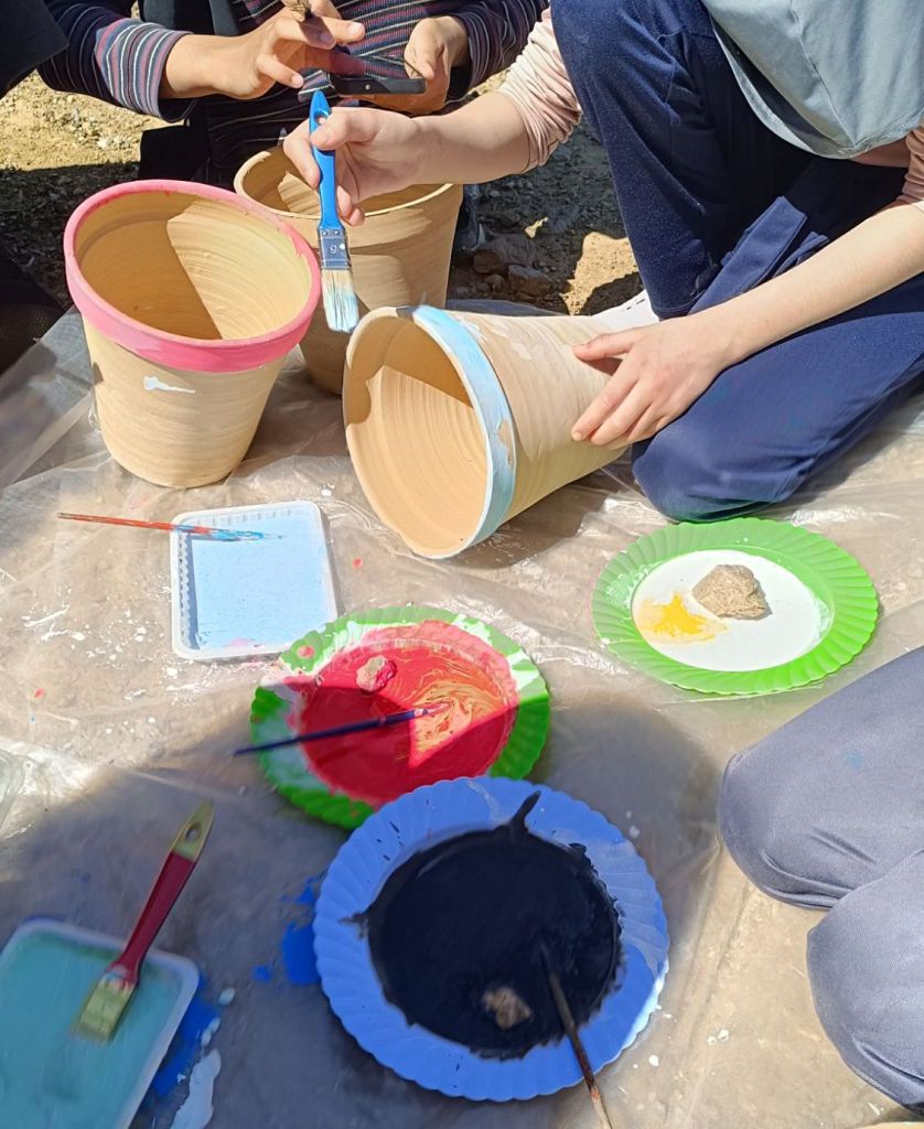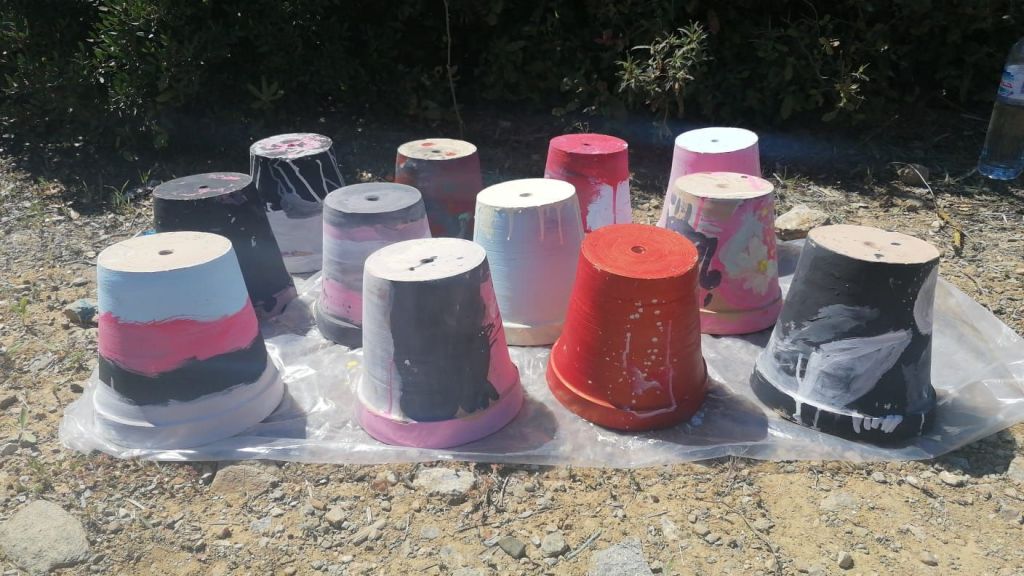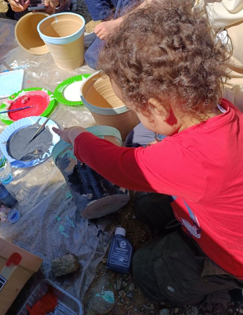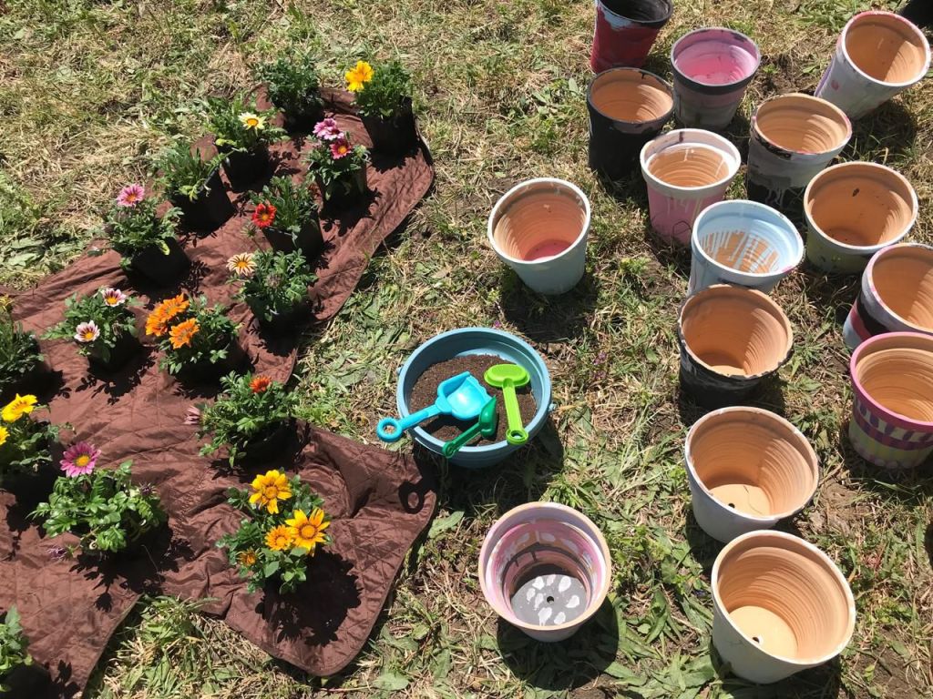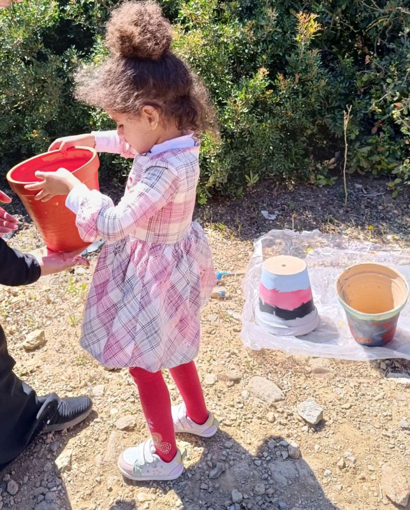 قام الأطفال صغارا وكباراً بصباغة أصيص الفخار ، وتركه يجفّ تحت الشمس.. سنستعمله لاحقاً لغرس شتلات الزهور..