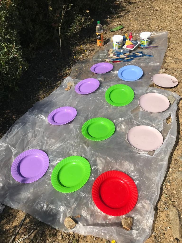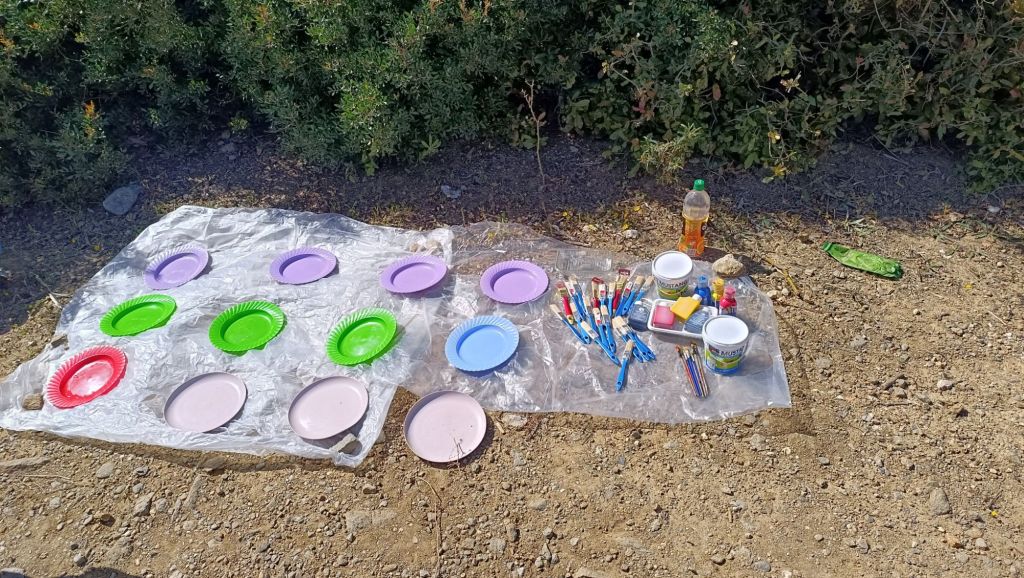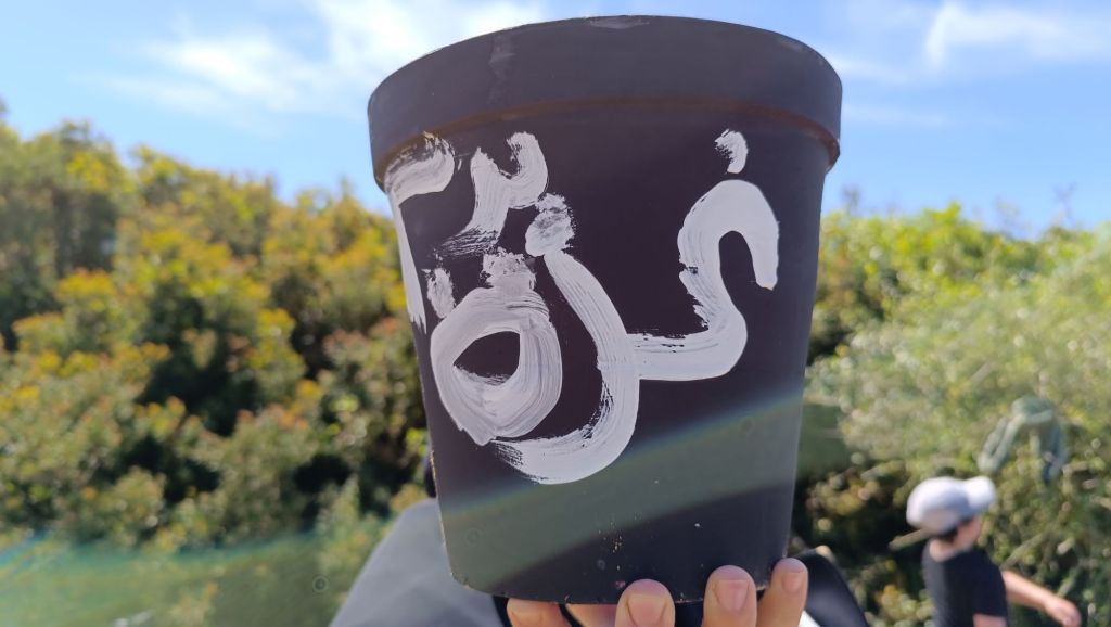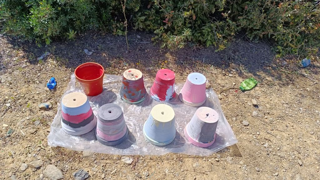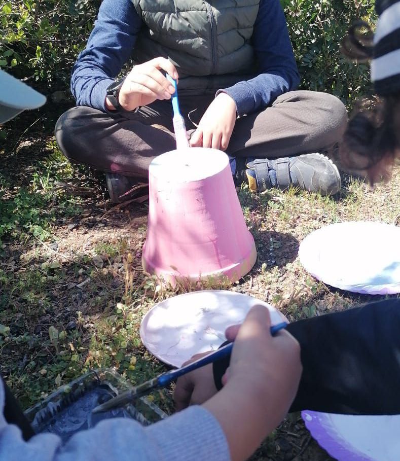 قام الأطفال صغارا وكباراً بصباغة أصيص الفخار ، وتركه يجفّ تحت الشمس.. سنستعمله لاحقاً لغرس شتلات الزهور..