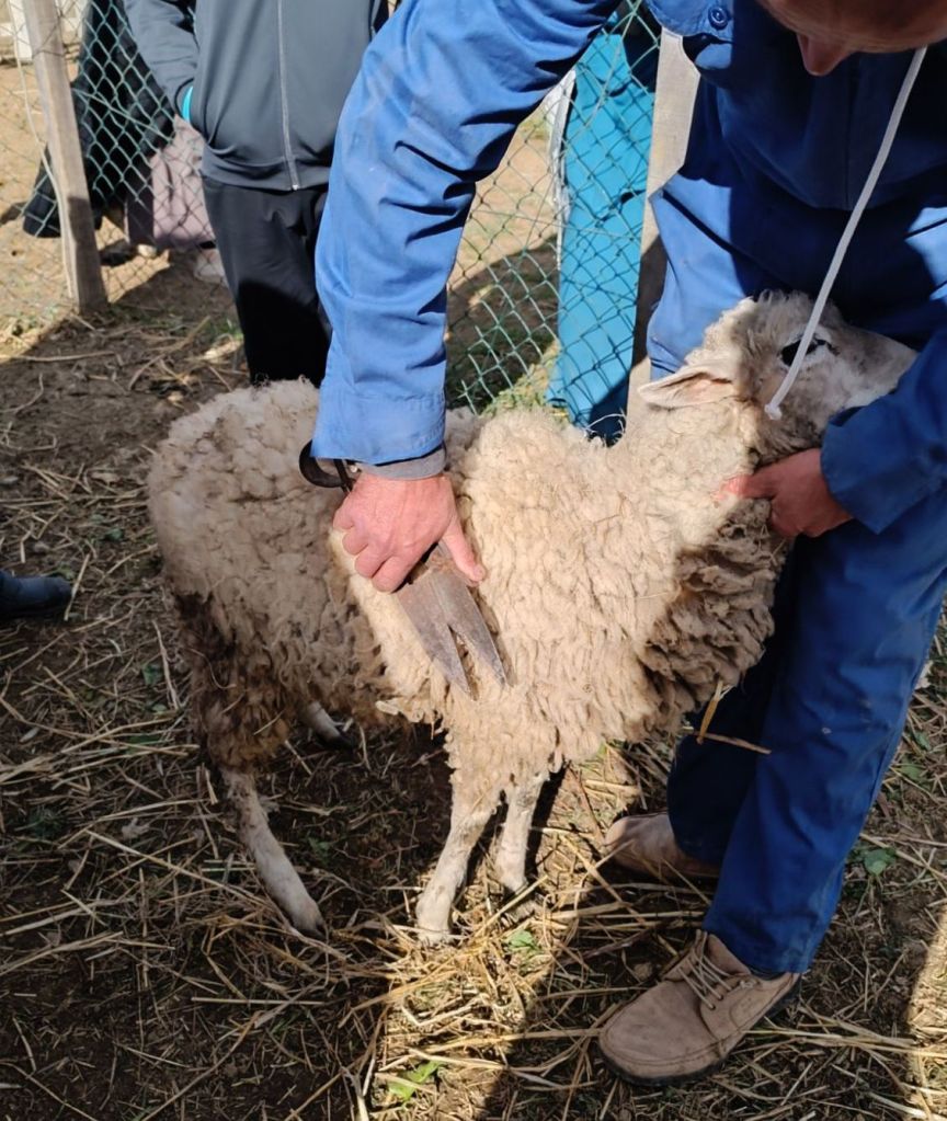 جربوا قص صوف الخروف بالمقص المخصص لذلك. اكتفينا بقدر قليل ، لأنه فصل الشتاء والخراف بحاجة لصوفها كي تتدفأ