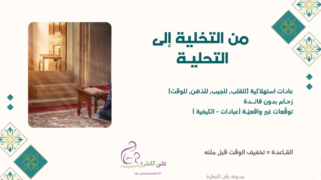 التخلية للقلب والعقل والبيت.. فكلّما أفرغنا نفوسنا مما يُكدّرها ويشتتها، غدونا أكثر صفاءً وحضوراً. وسيكون رمضان فرصة لنا للتزكية والتخلية أكثر فأكثر، فاللهم بلغنا رمضان.